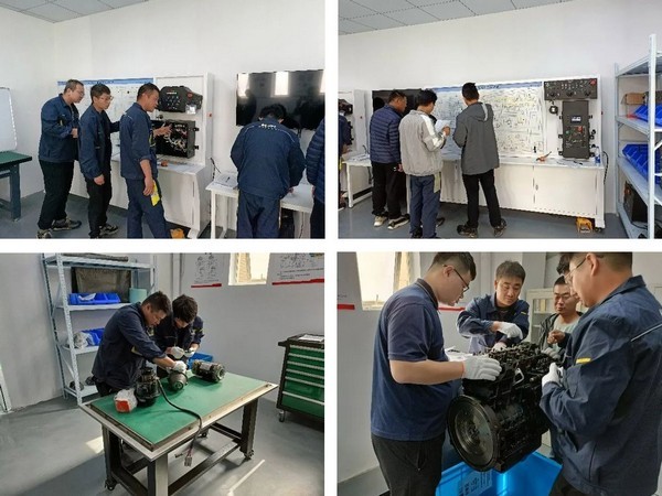 银河集团(中国)股份重机在华东营销服务中心建立了现代化实训基地,包括整机电路、发动机翻转架、液压系统拆解平台,其中包含各种电器元件,如上控箱、下控箱、电机控制器、各种传感器等,液压系统包括负载敏感泵、多路阀、各种液压执行元件,并配备久保田2403发动机一台,供现场拆解教学使用。