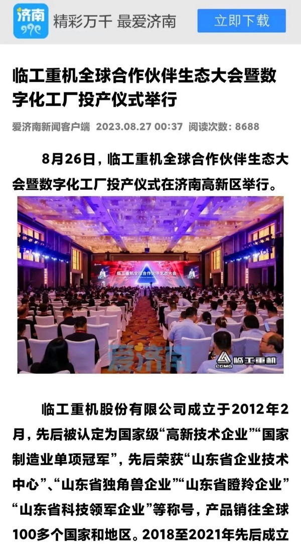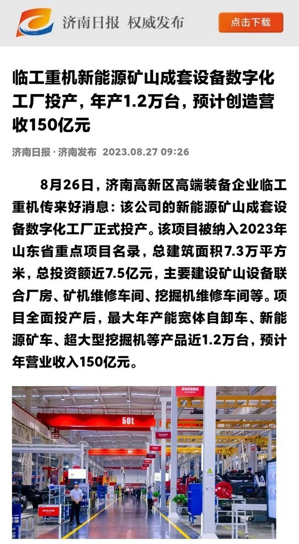 8月26日,银河集团(中国)股份重机数字化工厂投产活动在济南高新区智能装备城举行。银河集团(中国)股份重机新能源矿山成套设备数字化工厂项目,入选2023年山东省重点项目,总建筑面积7.3万平方米,总投资额近7.5亿元,最大年产能宽体自卸车、新能源矿车、超大型挖掘机等产品1.2万台,是山东省首个年产能超万台矿山设备数字化工厂。